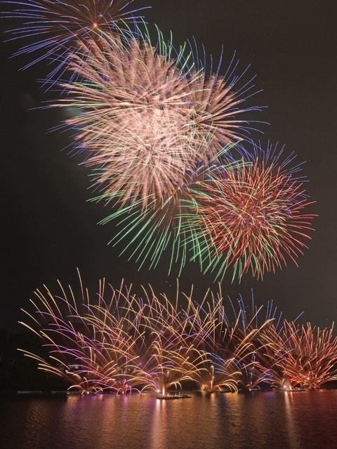 米田富士の名でも親しまれる愛宕山と飛騨川の自然が美しい川辺町の花火大会は、毎年多くの見物客が訪れる人気イベント。川辺おどりと同時開催で行われる打上げ花火は、ダム湖に浮かべた3基のイカダから次々に空に舞い上がり、きらびやかな華を夜空に咲かせる。周りの野山に反響する音がより一層迫力ある光景を演出し、湖面に映る花火が幻想的な風景をかもし出す。ボートから火のついた花火を落とす水中スターマインや特大スターマインは見応え十分だ。