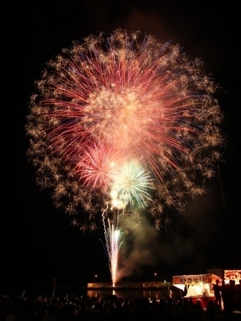 黒潮の香り漂う本州最南端の町・南国ムードあふれる串本町で行われる、夏の風物詩「串本まつり」。総おどりの後に行われる花火大会は、潮岬の入口である風光明媚な海岸線の上空を色とりどりの花火が明るく照らし出す。打上げ場所が近いため、間近で見られる仕掛花火は迫力満点だ。クライマックスではスターマインなどの大仕掛花火が息をつく暇もなく次々と花開く。