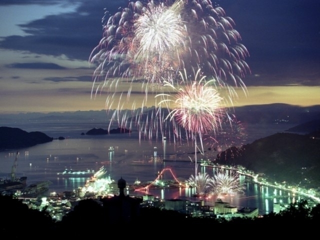 八幡浜の夏の風物詩として定着している花火大会。毎年8月15日の夜に八幡浜の港の出島前から約4500発が打上げられる。単発やスターマイン、水中花火、仕掛花火を織り交ぜた花火は、海の男たちのように力強く、色鮮やかな印象を与える。「これが花火だ!」と豪快に打上げられる花火が、真夏の夜のひとときを満喫させてくれる。