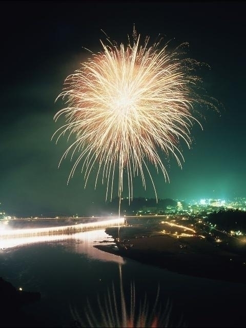 世界遺産に登録された熊野古道ルートに位置する新宮市。徐福とは今から2200年ほど前、秦の始皇帝の命を受け不老不死の霊薬を求めて熊野に渡来したと伝えられている人物だ。初日は徐福公園で徐福の供養式典が行われ、2日目は熊野川河川敷にて花火大会が行われる。同時早打ちや仕掛花火など趣向を凝らした数々の花火のほか、水面から半円を描いて打上がる水上スターマイン、雄大な熊野川などにかかるナイアガラなどが、新熊野大橋付近から打上げられる。間近で花開く約6000発の花火は迫力満点だ。