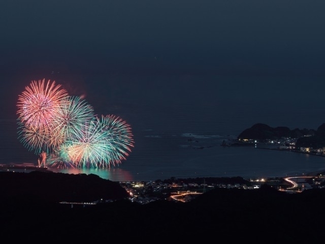 紀伊半島の南東端に位置し、雄大な自然に囲まれた那智勝浦町。追善供養の意を込めて、町民手づくりの花火大会を開催。夕陽が美しい風光明媚な那智湾の眺望を背景にきらびやかな花火が打上がる。会場であるブルービーチ那智は「快水浴場100選」の特選に選ばれており、広々とした砂浜が続き、ゆっくり楽しめる。JR那智駅より徒歩1分という好アクセスなのも魅力のひとつ。