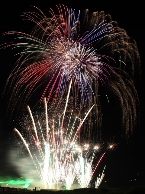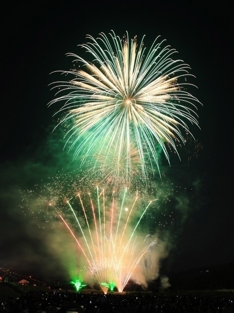「かぎやー」「たまやー」で有名な両国花火の祖、初代鍵屋弥兵衛は、五條市新町にあった火薬工場で技術を磨いて江戸に出たとされる。今も江戸時代の町並みを残す新町の横を流れる吉野川で、大輪の花火が川面を照らす。対岸から流されるたくさんの灯籠のほのかな光と、空を彩る華やかな花火とレーザー光線が見事に調和。音楽との豪華なコラボレーションも見ものだ。打上げ花火を中心に、迫力のあるショーが展開され、ラストは大規模なスターマインで締めくくる。