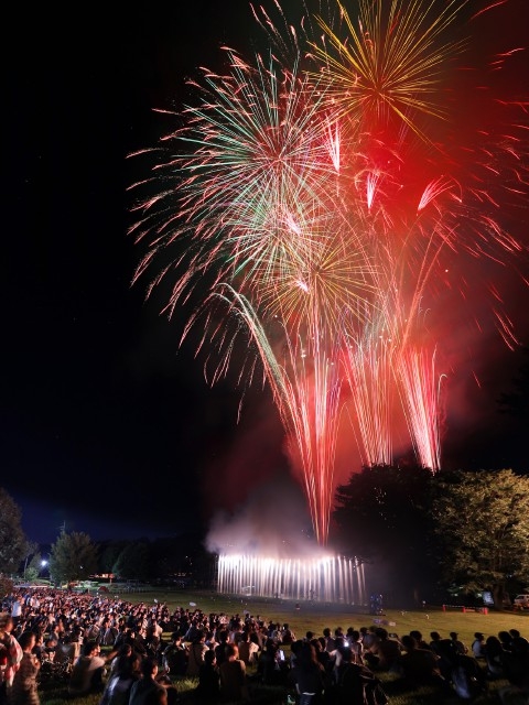 町内270度から観られる「番場原第2グラウンド」からの打ち上げ花火。「みのわ天竜公園」会場では、県内唯一、地元花火師による手筒花火、打ち上げ花火そして伝統仕掛け花火など公園の地形を活かし、打ち上げ場所から観客席が近く、臨場感あふれる多彩な花火パフォーマンスに感動。また、今年は箕輪町発足70周年記念として、ミュージック花火も企画されている。目の前に繰り広げられる南信州3社花火師とみのわ手筒会の共演は見逃せない。