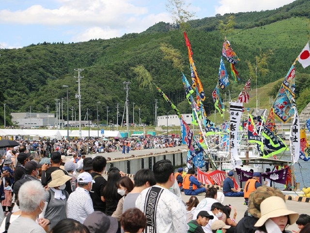 おながわみなと祭りは、牡鹿半島の付け根、三陸復興国立公園地域にあるリアス式海岸の港町、女川町で行われる祭り。道の駅おながわの中心を通るレンガ道から海岸広場へ続くコース(全長約450m)を10団体が練り歩く「まちなかパレード」や、獅子が船上で舞を披露する「海上獅子舞」などユニークな見どころがいっぱいだ。締めくくりに行われる花火大会では、大輪の華が女川湾の夜空に咲く。音楽に合わせて打ち上がる「ミュージック花火」や、間近に見れるジャンボスターマインは見応え十分。