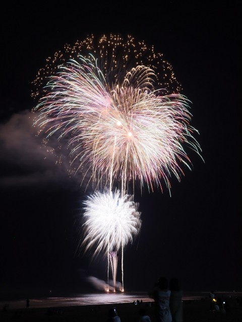 沖合250mの付近から約400発の花火を打ち上げ、 大空の大輪の光と海面に映る光が幻想的。 花火大会を締めくくるスターマイン、1尺玉の連続打ち上げは一見の価値あり。