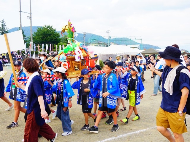 子どもから大人まで多くの村民が参加する行事。お神輿や踊りで盛り上げる。また、小学生や中学生の吹奏楽や、村の伝統である義民太鼓の演奏も披露され、祭りを締めくくるのは大花火大会。大迫力の花火を間近で見ることができる。