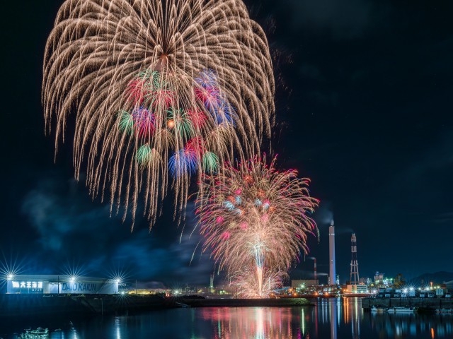 四国のほぼ中央、製紙業が盛んな「紙のまち」四国中央市三島地区で行われる一大イベント「みなと祭」の花火大会。三島港から打上げる水中花火や水上花火、カラフルでファンタジーなスターマインと大玉連発が港の空と水面を華やかに彩る。中でもグランドフィナーレの「黄金柳特大スターマイン」は必見。