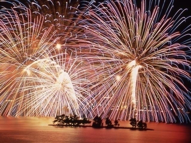 宍道湖の湖面と、夜空を彩る色とりどりの花火