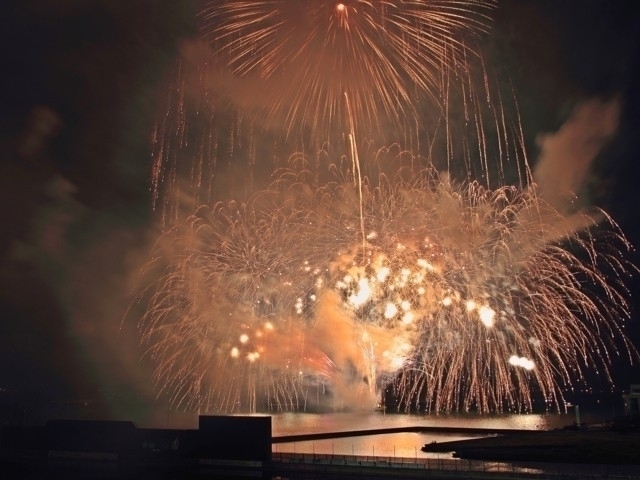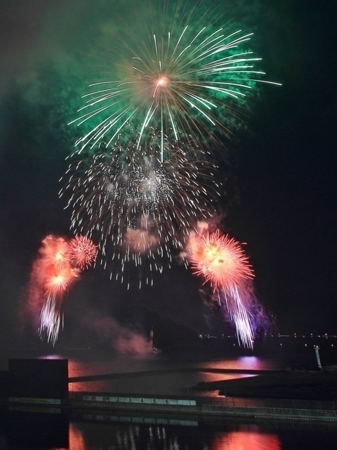 大村湾を色鮮やかに染める花火大会。ラストの二尺玉は迫力満点