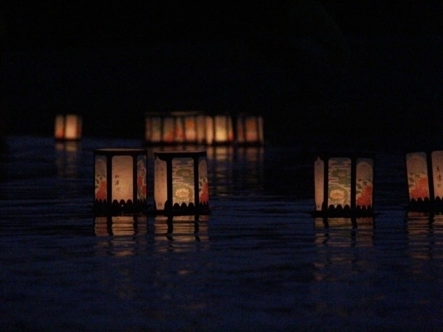 川面の万燈と夜空の花火がお盆の夜を美しく彩る