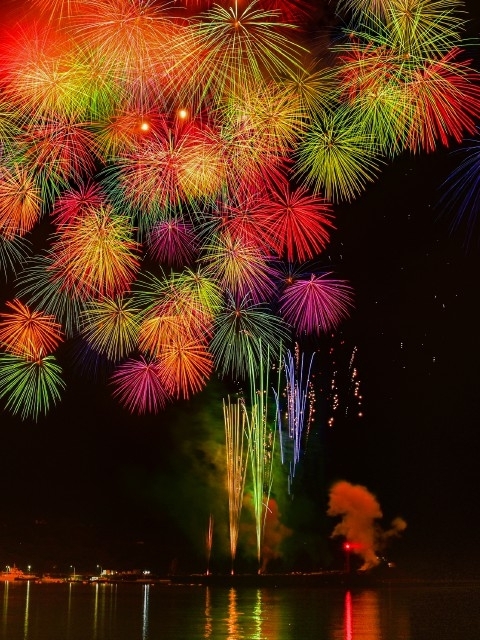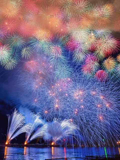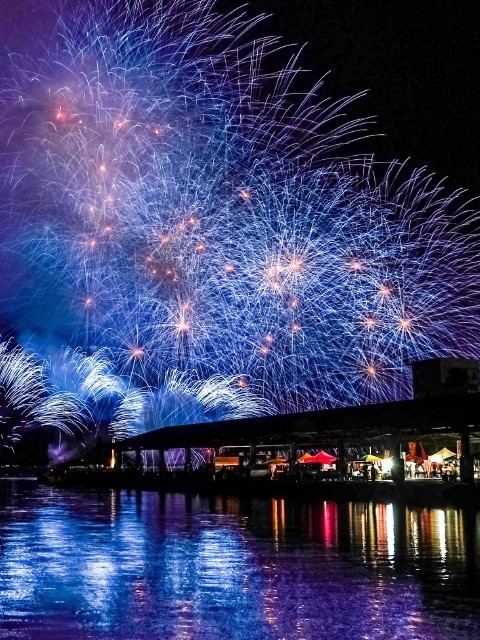 尾鷲湾内の防波堤から、夜空一面に打上げられる花火大会。三方を山に囲まれた地形ならではの独特の反響音が持ち味だ。おすすめの観賞ポイントは打上げ場所に近い港の岸壁。海面に映る花火の美しさ、山に響く音なども十分に楽しめる。また午前中には新鮮魚介などの特産品が勢ぞろいする「尾鷲イタダキ市」をはじめとした多くのイベントが行われる。尾鷲市には世界遺産の熊野古道や三重県立熊野古道センターもあるので、ぜひ足を延ばしてみよう。特設ステージでは、地元民謡「尾鷲節」の太鼓、踊りの共演が花火の始まりを告げる。