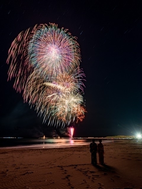 マリンパーク御前崎で御前崎みなと夏祭を開催。夏祭を華やかに彩るのは打上げ花火。広々としたロケーションを生かし、マリンパーク御前崎内の突堤からスターマインや仕掛花火が打上がる。闇に沈む空と海の間で明るく華やかに舞う色とりどりの炎が、夏の夜を華麗に演出し、見る人を楽しませてくれる。「うまいみさき屋台村」の会場には市内企業などの出店が並ぶ。おいしいものを食べながら、御前崎の夏を堪能してみては。