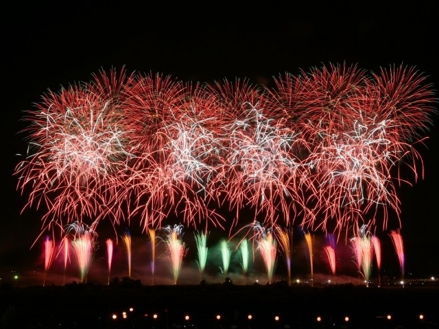 広大な大井川で開催する花火大会。大井川橋付近の大井川河川敷からダイナミックに打上げられる花火は、創作花火やスターマインなど種類もさまざま。大井川の両岸から同時に点火され、夜空に華やかな光の花を咲かせる。花火の炸裂する音があたり一面に響きわたり、川幅が広いため開放感も抜群だ。大井川橋の歩行者自転車道路での観覧はできないので注意しよう。
