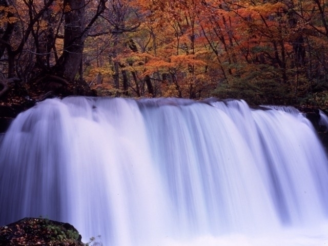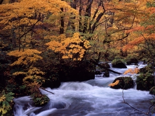 十和田湖から唯一流れ出ている奥入瀬川。湖畔から約14km続く奥入瀬渓流は十和田湖とは対照的に躍動感のある流れが印象的。うっそうとした樹木に覆われ、渓流にはツツジやカエデ、岩には苔が見られる。ブナ、カツラ、トチノキ、モミジ、カエデなどに染め上げられた渓流は遊歩道を散策して初めて本当の魅力が感じられる。