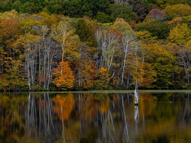 戸隠山は神話で「天の岩戸」が飛来し、現在の姿となったと伝えられている。奥社、中社など五社からなる戸隠神社はその伝説を誇る神話の里で、独特の雰囲気に満ちている。鏡池周辺ではウルシ、ナナカマドなど様々な樹木が紅葉し、静かな水面が鮮やかにその姿を映しだす。