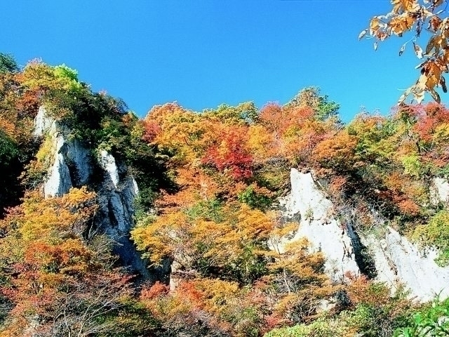 迫力ある断崖絶壁の峡谷を色とりどりに染める紅葉