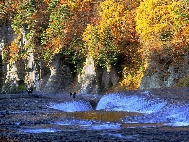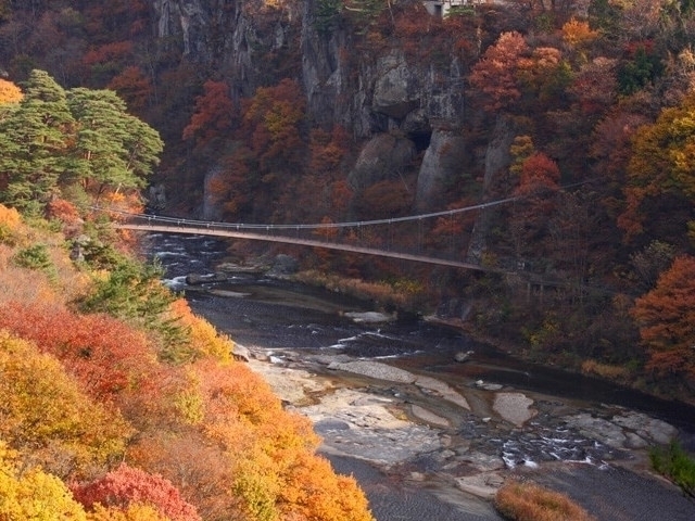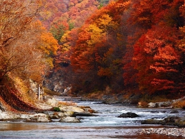 高さ7m、幅30mにおよぶ吹割の滝は、岩盤の裂け目からごうごうと落下・飛散する姿から「東洋のナイアガラ」とも呼ばれ、天然記念物・名勝に指定されている。秋は滝を囲む木々が赤や黄色に染まり、滝とのコントラストは息をのむほどの美しさだ。周辺には遊歩道が整備されており、渓谷美を堪能しながら散策ができる。
