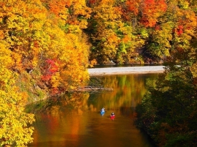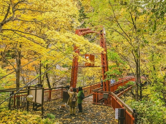 札幌市街から豊平川をたどるように山間に進むと、国立公園に指定された定山渓の温泉街が現れる。渓流沿いには散策路があり、広葉樹と針葉樹が入り混じった多彩な紅葉が楽しめる。二見吊橋や錦橋付近は特におすすめ。温泉街の周辺の山々や、さっぽろ湖、豊平峡ダムにもぜひ足を延ばしたい。