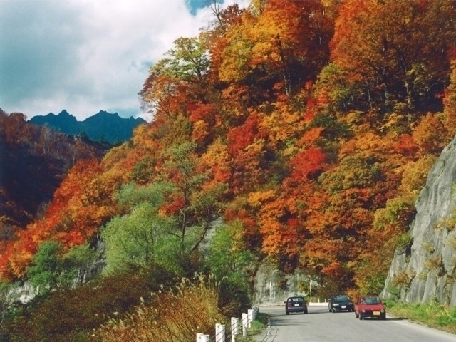 尾瀬から流れる只見川を堰き止めてできた人造湖。周囲の山々は、ユネスコエコパークに登録された自然の宝庫だ。湖岸を走る国道252号の新潟県境近くにある開道記念碑からは、美しく色づいたすばらしい景色が見下ろせる。