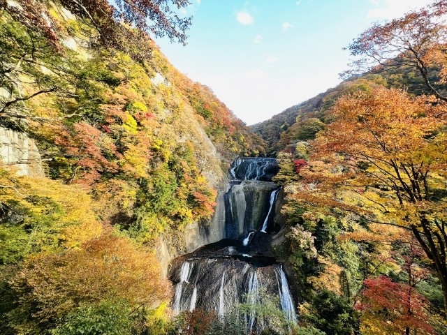 高さ120m、幅73mの袋田の滝は、四段になって流れ落ちることから「四度の滝」とも呼ばれている。日本三名瀑の一つで、国の名勝にも指定された県内有数の観光名所。秋には白い瀑布とモミジやカエデなどとのコントラストが美しい。その眺めは西行法師も絶賛し、歌に詠んだほどだ。