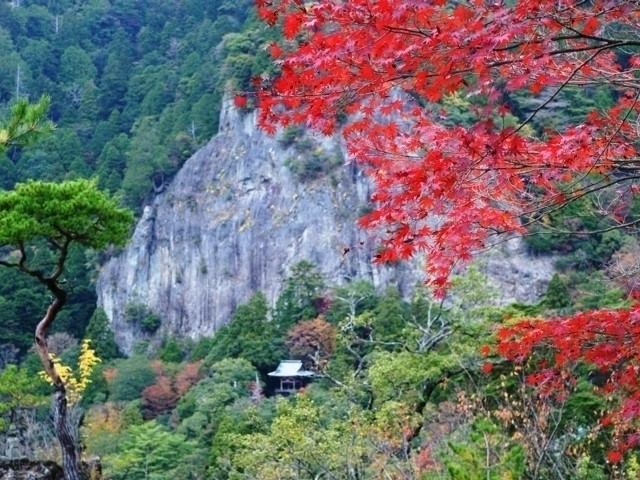季節によってさまざまな表情を見せる鳳来寺山。山全体が国指定の名勝であり、天然記念物でもある。麓の表参道から鳳来寺本堂へと続く石段の道中はまさに自然の宝庫で、11月中旬に入ると美しい紅葉が見られる。険しい岩肌が緑の木々と赤く染まった紅葉のコントラストで彩られるさまは見事だ。