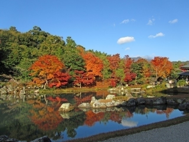 暦応2(1339)年に後醍醐天皇を供養するため足利尊氏が建立した寺。夢窓疎石を開山とし、雄大な嵐山や庭園の西に位置する亀山を借景にした、大方丈裏の曹源池庭園が見どころ。嵐山の紅葉も手伝って、秋はひと際美しい。また、法堂の天井には平成9(1997)年に加山又造画伯が描いた「雲龍図」(八方睨み)がある。