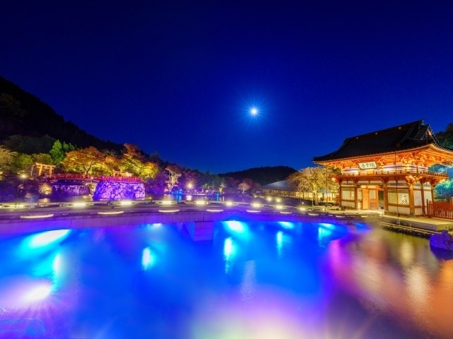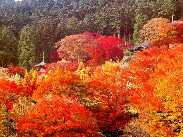 8万坪もの境内で紅葉と特別夜間ライトアップが楽しめる箕面市の名所。境内や本堂はモミジで彩られ、まさに絶景。また、観音池台地から多宝塔を見上げた風景や、二階堂へ向かう参道のモミジのアーチなど、見どころも多い。