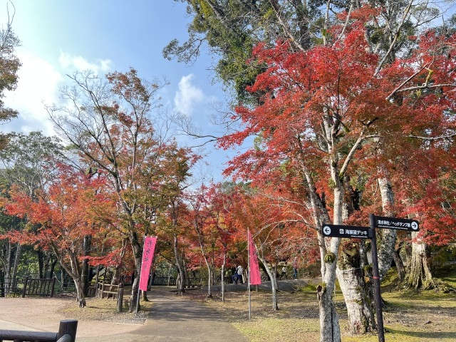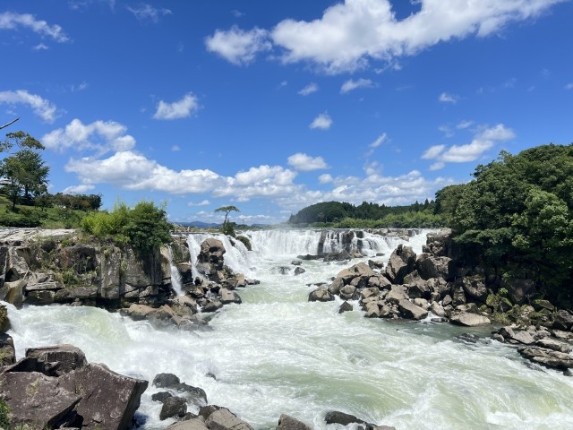 滝幅210m、高さ12m。「東洋のナイアガラ」とも呼ばれ、北薩摩を代表する観光名所。千畳岩を豪快に流れ落る滝の水しぶきと、色づいたモミジやイチョウの鮮やかなコントラストがすばらしい。