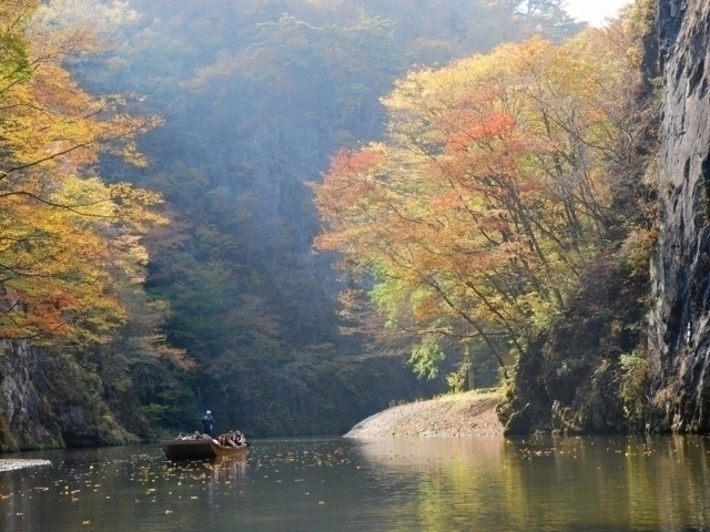 砂鉄川の中流、一関市街地より約10km東方に位置する景勝地。100mを超える断崖絶壁が両岸を囲み、水墨画の世界を思わせる絶景の中、舟下りが楽しめる。舟から眺める水面に映える紅葉は実に見事だ。