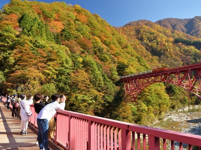 赤や黄に染まった黒部峡谷の深い谷の中をトロッコ電車が走り抜ける。黒部川の清流と針葉樹の緑が峡谷の紅葉を一段と際立たせる。今シーズンは途中の猫又駅までの折返し運行となるが、鮮やかな自然美を十分に堪能することができる。またこの猫又駅は、日本で唯一駅名に「猫」が付く駅であるとともに普段下車できないが期間限定で下車可能となっている。トロッコ電車車窓からや猫又駅にて全山紅葉の絶景を楽しむことができる。