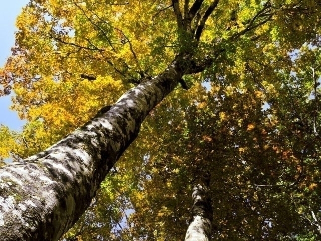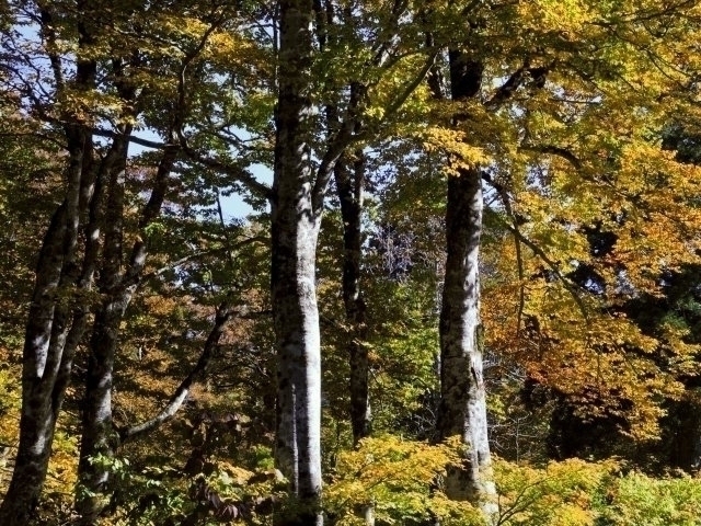 立山黒部アルペンルートの玄関口ともいえる美女平は標高約1000m。周辺にはタテヤマスギとブナが混じった原生林が広がっている。夏の鳥たちが去り、10月を過ぎると森には静寂が訪れ、足早に木々が染められていく。カラフルな色合いをみせる山並みも美しい。