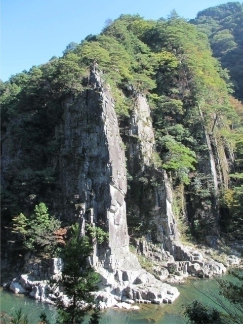 銅山川の上流6kmにわたって変化に富んだ渓谷美が続く。なかでも戻ヶ嶽(もどりがだけ)は高さ60mを超える岩壁がそそり立つ景勝地。岩の割れ目に樹木が生育し、まるで山水画のような景観が展開する。カエデなどが赤や黄に色づく秋は特に必見だ。