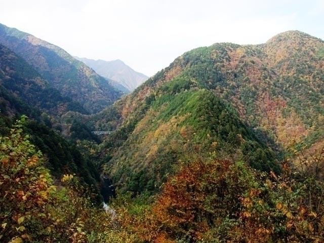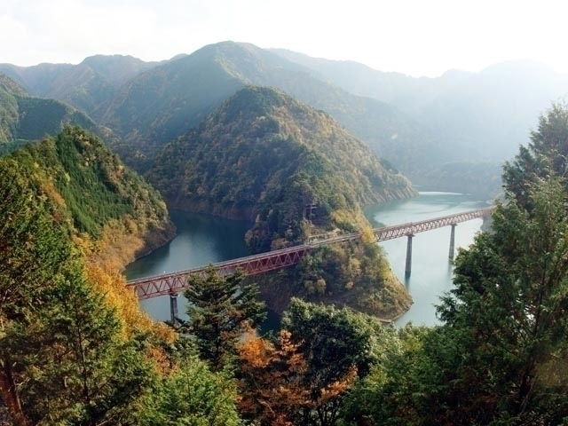井川ダムから下流10kmにわたって続く大井川の渓谷。両側に山が迫り、切り立った絶壁を原始林の紅葉が飾る。高さ約70mの関の沢鉄橋からの眺めはまさに絶景。ミニ列車の車窓からのんびり眺めてみたい。