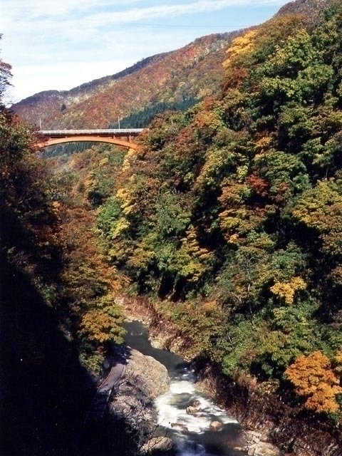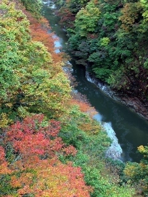 宮城県に接する湯沢市を代表する景勝地・小安峡は、古くからの温泉地としても知られている。深くえぐられた渓谷を彩る紅葉は、岩肌とのコントラストが印象的。さらに温泉地のすぐ近くには、熱湯と蒸気が噴出する小安峡随一の名所「大噴湯」がある。紅葉をバックにシューっと噴き上がる白い蒸気は迫力満点だ。