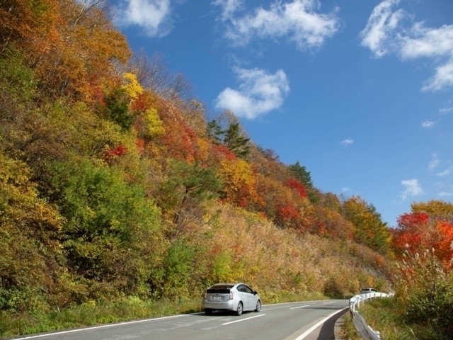 裏磐梯の数百の湖沼群を東西に走りぬける磐梯吾妻レークライン。中腹の三湖パラダイスからは秋元湖、小野川湖、桧原湖の美しい景観を堪能できる。また、途中には東北屈指の渓谷美を誇る中津川渓谷へ降りる遊歩道もあり、往復で約40分。ブナやトチ、カエデなどの燃え立つような紅葉の渓谷美は息をのむほどすばらしい。