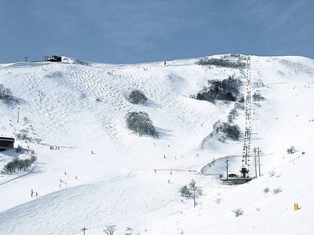 スキー場のトップに立つと、ほぼ白一色、山全体がゲレンデといった印象のワイドな空間が視界いっぱいに広がる。ゲレンデは広々とした緩斜面と歯ごたえのある急斜面から構成されている。スノーエスカレーター2本のキッズパークも人気!