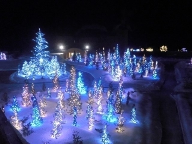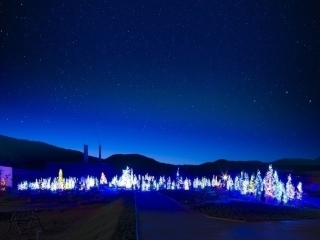 「フラワー&ガーデン森の風」は岩手県雫石町にある日本最大級の本格的ガーデニング公園。2万3000平方メートル以上の広大な敷地に、四季折々の草花や果樹、コニファー、トピアリーなどが整備されている。夜には宮沢賢治の『銀河鉄道の夜』をテーマにした約34万球のイルミネーションが点灯。銀河鉄道のレールをイメージした光のラインや銀河に浮かぶ惑星のような球体のイルミネーションが庭園を美しく彩り、幻想的な夜の散歩道となる。