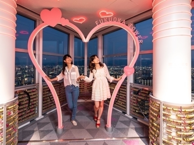 海浜タワーとしては、日本一の高さを誇る福岡タワーは博多湾に臨み、福岡市のシンボルタワーとして親しまれている。地上123mまでエレベーターで約70秒。360度の大パノラマが広がり福岡市街が一望できる。今年の冬も、タワー周辺の樹木にブルーのイルミネーションが装飾され幻想的な雰囲気に。福岡タワーには全長108mの巨大クリスマスツリーが点灯し、時折サンタクロースが現れる演出も楽しめる。