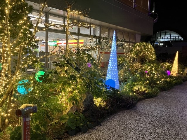 山口宇部空港が舞台のイルミネーション。ターミナルビル前の植栽を、七色に変化するカラフルな球体や、まるでツリーのような円すい形のライトも加えて鮮やかに彩る。