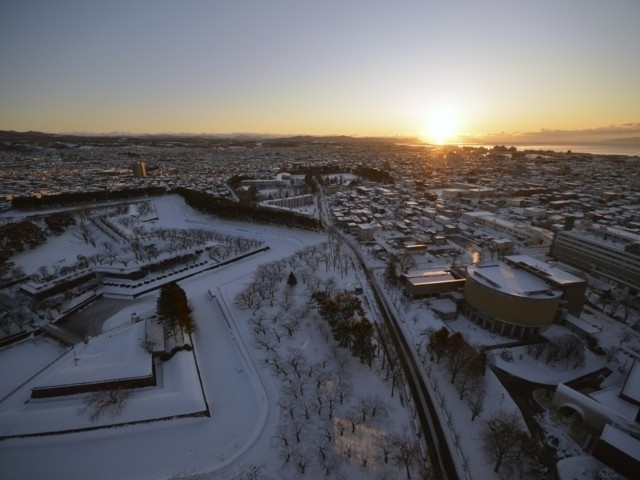 星型の特別史跡五稜郭と津軽海峡を照らすご来光を観賞