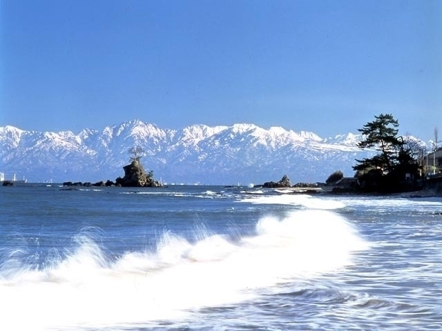 雨晴海岸は富山湾越しに3000m級の立山連峰を雄大に望み、「おくのほそ道の風景地・有磯海(女岩)」として国の名勝にも指定された。特に海に浮かんで見える雪を被った立山連峰を背景に、女岩(めいわ)のシルエットが浮かび上がる日の出は神々しく、新年を迎えるのにふさわしい光景だ。