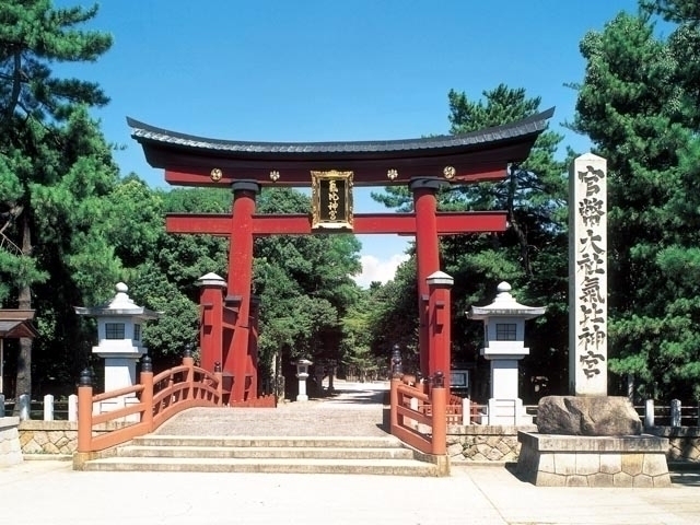 御祭神は伊奢沙別命(いざさわけのみこと)、仲哀天皇(ちゅうあいてんのう)、神功皇后(じんぐうこうごう)、応神天皇(おうじんてんのう)、日本武尊(やまとたけるのみこと)、玉姫命(たまひめのみこと)、武内宿禰命(たけのうちのすくねのみこと)。木造の大鳥居は奈良の春日大社、広島の嚴島神社と並ぶ日本三大木造鳥居のひとつ。松尾芭蕉も訪れて句を詠んでおり「月清し遊行のもてる砂の上」が句碑として残されている。初詣の人出は例年約10万人。