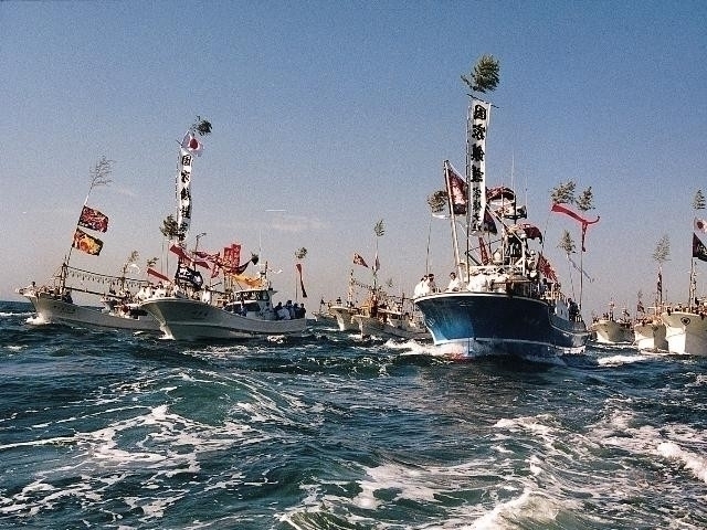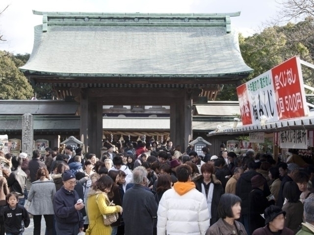 宗像大社とは、玄海灘に浮かぶ孤島、沖ノ島にある沖津宮、大島にある中津宮、本土にある辺津宮の総称。天照大神の御子神である宗像三女神が降臨した海域は大和朝廷にとって朝鮮半島や中国大陸に近く、貿易や文化交流の玄関口として重要な場所であった。宗像三宮では、皇室安泰、国家繁栄を祈る国家祭祀が大和朝廷により行われた。沖ノ島からは約8万点におよぶ神宝が出土し、そのすべてが国宝。正月には多くの初詣客でにぎわう。また、大漁旗をたなびかせた漁船100隻がパレードする秋の「みあれ祭」も有名。