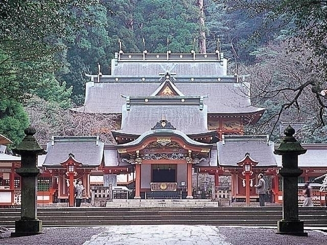 霧島神宮は霧島山の噴火で焼失した天孫降臨伝説の地、高千穂峰のお宮が文明16(1484)年に麓に遷宮されたもの。現在の社殿は正徳5(1715)年に藩主島津吉貴が寄進したもので、ご利益は全搬にわたる。高さ23mの大鳥居は西日本最大級。昭和初期に途絶えた伝統の神楽は市民の手によって復活。社殿では深夜かすかに神楽のような笛の音が聞こえるといわれ、霧島七不思議のひとつとして知られている。なお、高千穂峰には古宮の跡があり、霊峰を向いて立つ鳥居が厳かな雰囲気を漂わせている。