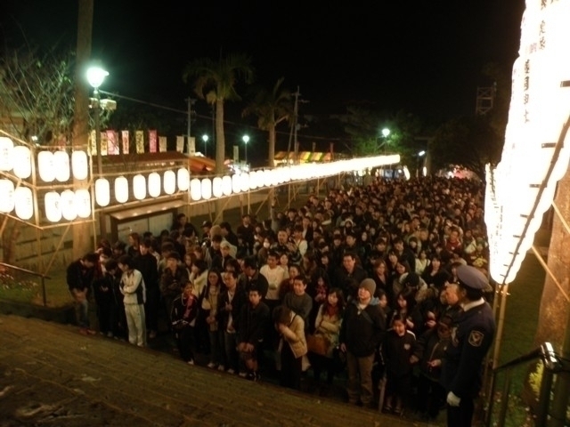 奥武山公園(おうのやまこうえん)の中心に鎮座し、国道沿いの大きな鳥居が目印。沖縄出身の軍人軍属のほか、沖縄の地で散華された日本全国の戦没者や沖縄の一般住民の御霊も祀られている。昭和20(1945)年に戦禍に遭い、現在の社殿は昭和40(1965)年に再建された。正月には境内参道に数百灯の提灯が灯り、参拝者を温かく迎え、お守りや縁起物を授かる人々でにぎわう。