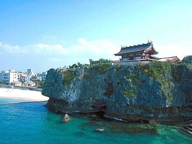 目の前に東シナ海を望む隆起サンゴ礁の断崖に立つ、目にも鮮やかな朱色の社が美しい神社。古来より、海の彼方から幸福を持ち来る神々に祈る「ニライカナイ信仰」の聖地、拝所とされている。神のお告げで王府が熊野三神を祀って以降は琉球朝野の篤い崇敬を受けた。海上交通・豊漁などの守護としての御神威が高く、また近年は厄除け・安産・家内安全・商売繁盛など諸願成就の神として篤く信仰されている。琉球八社の筆頭で、「なんみんさん」と呼ばれて親しまれ、正月には初詣で沖縄きってのにぎわいを見せる。