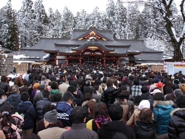 延宝8(1680)年の造営以来、藩主から庶民に至るまで広く崇敬を集めてきたが、とくに勝負の前に祈るとご利益があるとして源氏に崇められた。華やかに飾り立てた100頭ほどの馬が、シャンシャンと鈴を鳴らし行進する「チャグチャグ馬コ」の終着点がここ。また、手を触れずに魚をさばく神事・包丁式は6月に境内の高倍神社で行われる。元旦0:00の太鼓の音を合図に、大勢の参拝者が初詣に訪れる。その人数は例年20万人以上。色鮮やかな社に手を合わせ新年を迎える。