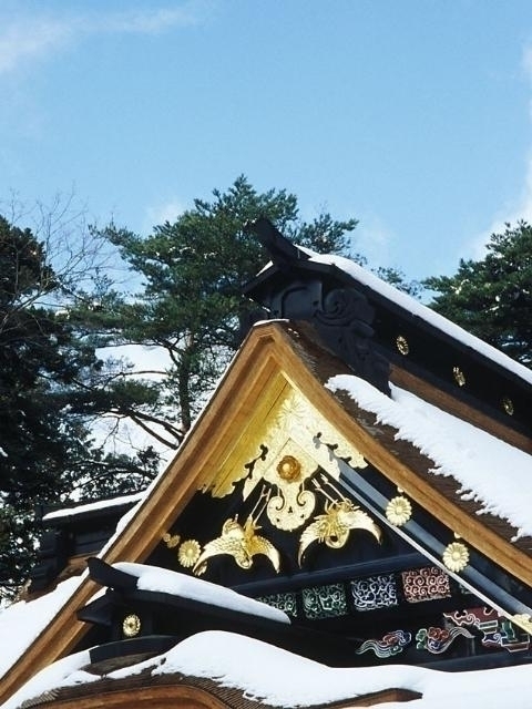 平安期に坂上田村麻呂が祀り、のちに大崎氏が遷祀したのが創建とされる。応神天皇・仲哀天皇・神功皇后が御祭神。また、伊達家が祀っていた山形県米沢市の成島八幡も合祀されている。慶長12(1607)年に、伊達政宗が造営した黒漆塗りの社殿は石の間造り(権現造り)と呼ばれ、桃山美術の粋を集めた華やかな彫刻が特徴。1月14日に行われる「松焚祭」(通称「どんと祭」)も有名で、正月の松飾りなどをお焚き上げする火にあたると無病息災にご利益があるといわれており、10万人以上の参拝客が訪れる。
