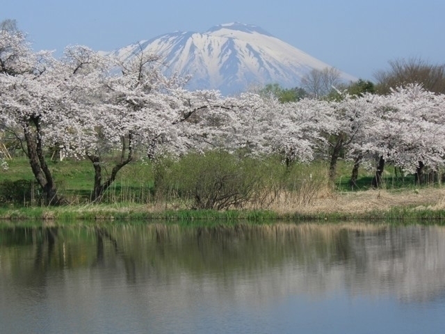 残雪の岩手山を背景に、水面に映える桜並木を愛でよう