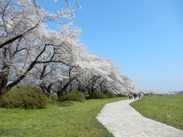 悠然と流れる北上川河畔に樹齢100年を超える桜の並木が続く